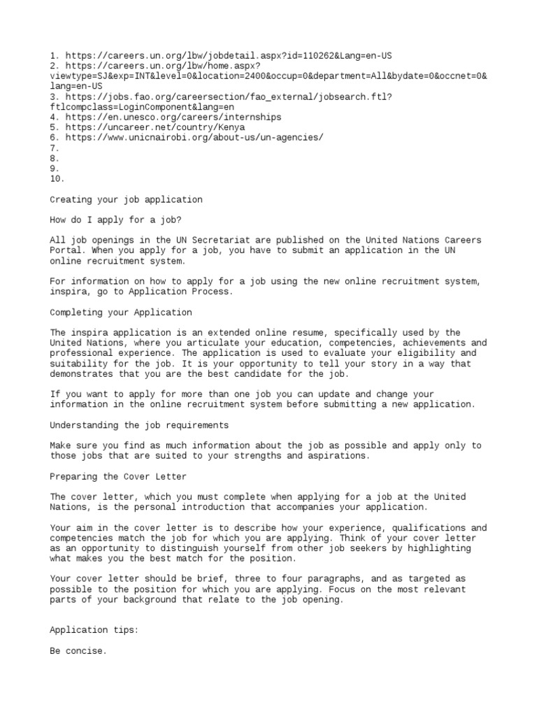 I can be reached at 0712 345678 for any enquiries regarding my application. Application cover letter for un jobs Cover letter sample for an unadvertised job. A letter of application, also known as a cover letter, is a document sent with your resume to provide additional information about your skills and experience to an employer. A good cover letter can help the employers pick out the most suitable candidate for the job. Cover letters should be around three paragraphs long and include specific examples from your past experience that make you qualified for the position. A job application at the united nations is made up of a profile section (my profile), and an application form that includes a cover letter, all of which should be prepared online on this website. Rated 4.78 out of 5 based on 9 customer ratings. Access our database of cover letters for internships and recent grad positions. And these differentiations are among others extremely important for your un job. The main aim of a cover letter is to see how an applicant demonstrates their job history, qualification details, and talent for a selected vacancy. There are plenty of opportunities to land a position, but it won't just be handed to you. Your winning cover letter from the only firm to guarantee the best cv!